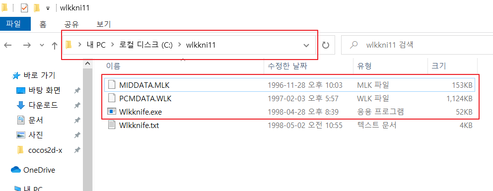 저는 C:\wlkkni11 폴더를 만든 후, 해당 폴더에 wlkknife.exe 파일과 MLK/WLK 파일들을 옮겨두었습니다.