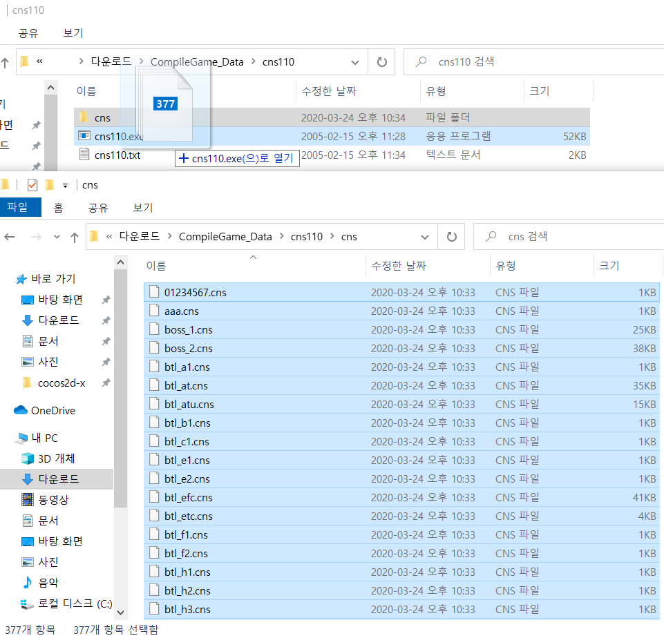즉 추출실패마다 프로그램이 종료되기에... 실패한 바로 뒷 파일부터 다시 cns110.exe에 드래드 & 드롭해주셔야합니다.
