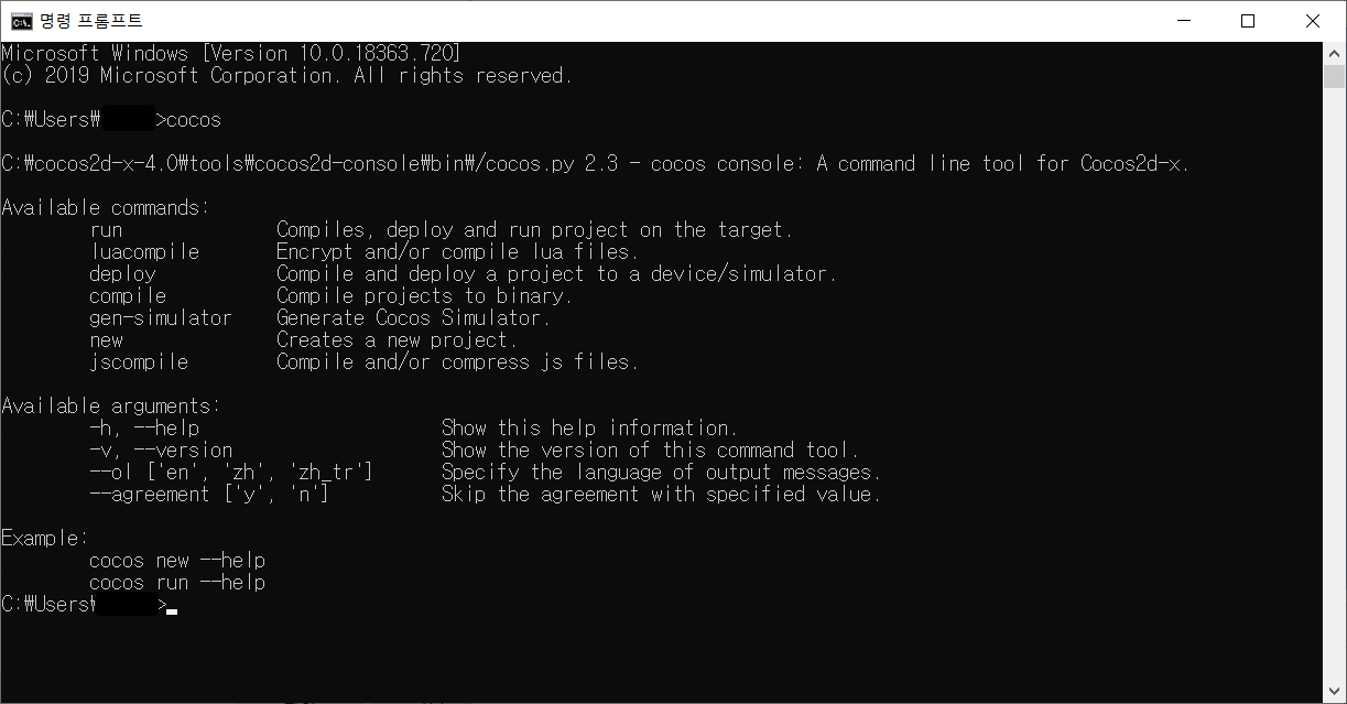 커맨드창(cmd)에서 cocos 입력시, 아래와 같이 cocos 명령어가 동작합니다.