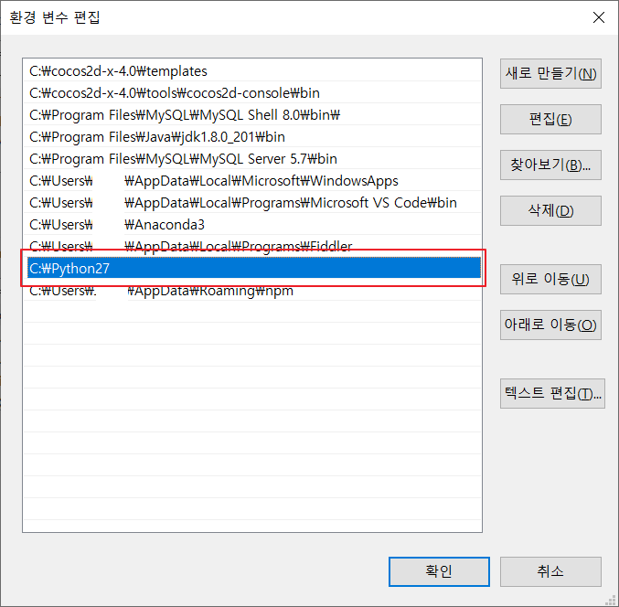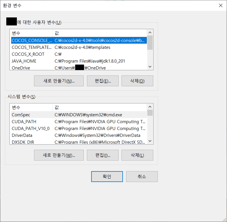모두 완료되고 나면, COCOS에 대한 환경변수들이 추가되어있는 것을 확인할수 있습니다.