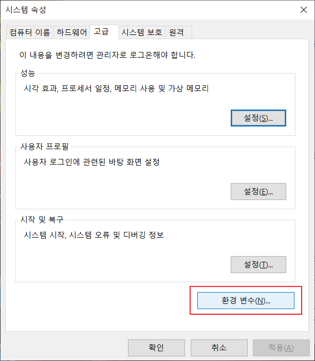 4) 시스템 속성 팝업이 뜨면, 아래의 [환경 변수] 버튼 클릭